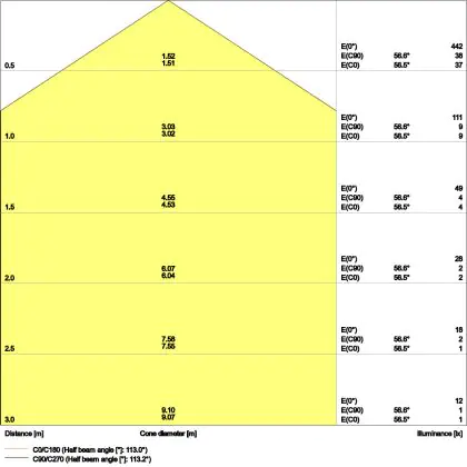 De gradenbundel geeft informatie over hoe breed het licht wordt uitgestraald. Dit zit tussen de 0 en 360 graden (D). Hoe kleiner de hoek, hoe specifieker de lichtbundel is. Over het algemeen is een smalle gradenbundel perfect voor sfeer- of accentverlichting, terwijl een brede gradenbundel ideaal is om grote oppervlaktes te verlichten.